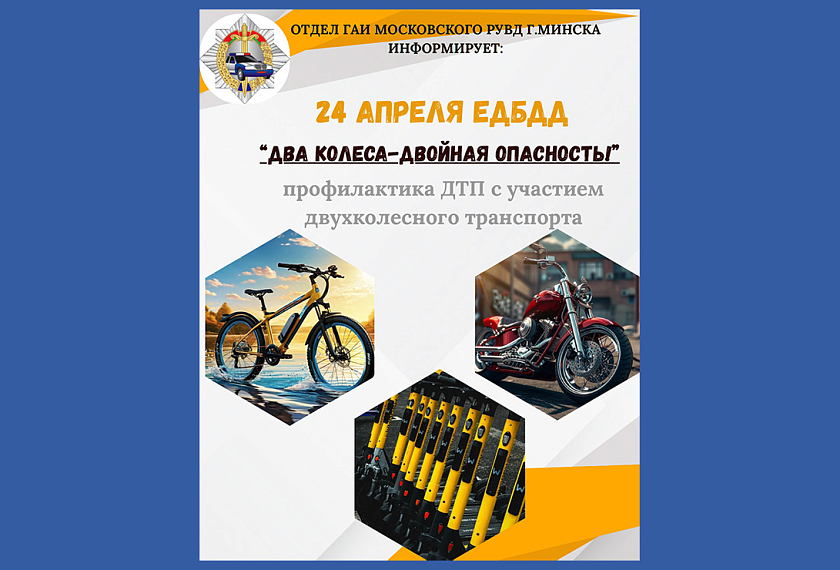 24 апреля Госавтоинспекция проведет Единый день безопасности дорожного движения под девизом «Два колеса-двойная опасность!», профилактика ДТП с участием двухколесного транспорта.