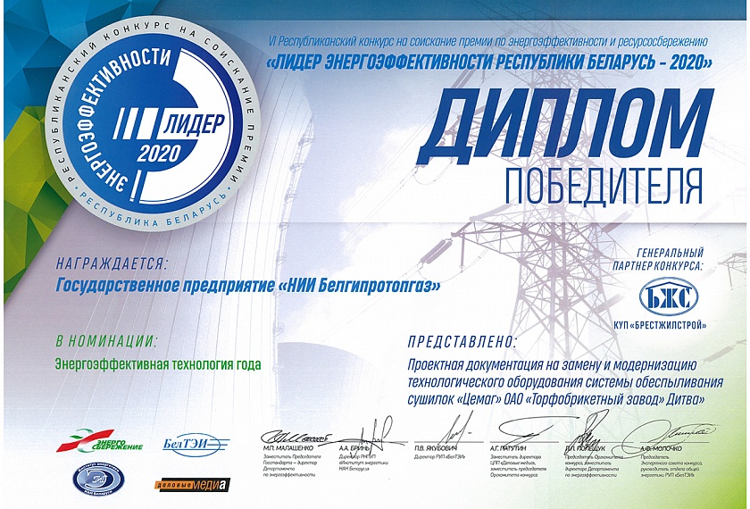 В числе лидеров энергоэффективности – государственное предприятие «НИИ Белгипротопгаз», которое стало победителем в номинации «Энергоэффективная технология года», представив на конкурс разработанную проектную документацию на замену и модернизацию технологического оборудования системы обеспыливания сушилок «Цемаг» ОАО «Торфобрикетный завод Дитва».